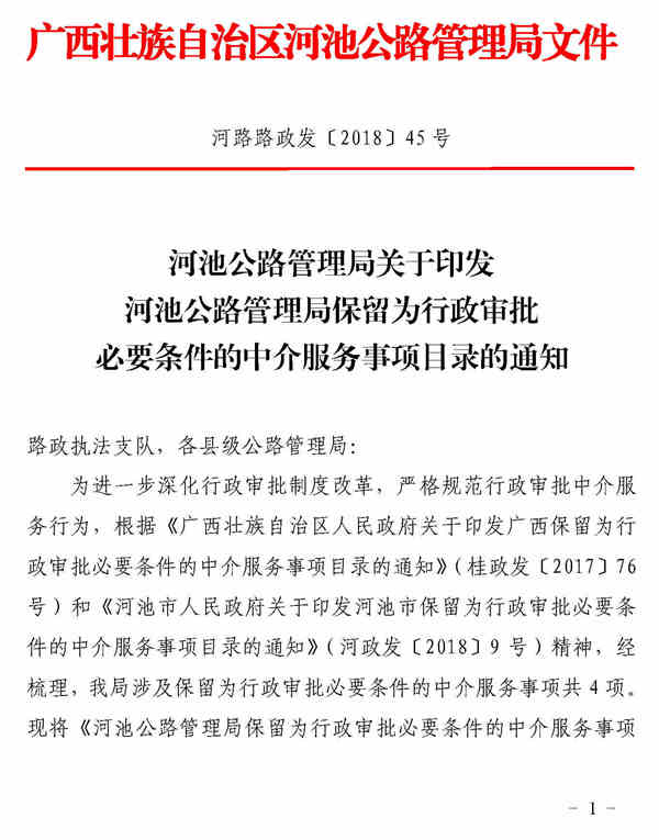 河池公路管理局关于印发河池公路管理局保留为行政审批必要条件的中介服务事项目录的通知河池公路管理局关于印发河池公路管理局保留为行政审批必要条件的中介服务事项目录的通知