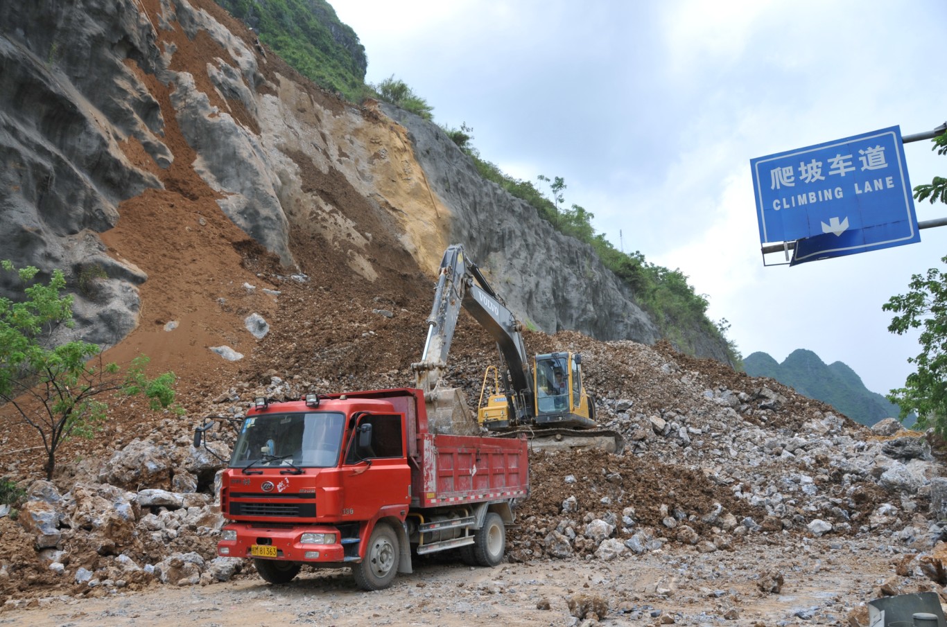 险情发生后,河池市人民政府市长何辛幸、副市长李文纲赶赴现场指挥抢险和交通疏导工作。何辛幸强调,要把人员安全放在首位,科学制订方案,全力以赴开展抢险和交通疏导工作,尽快恢复道路畅通。河池公路管理局立即启动突发事件应急预案,局长唐祥明、副局长罗世斌、副局长农正定等领导第一时间赶赴现场,研讨抢修方案,迅速调集人员、机械处置抢险。由于塌方山体高达百米,而且比较陡峭,加上近日来多次降雨,又发生了数次塌方泥石流,使抢险工作受到了极大影响。为确保9月3日开始的第十届中国—东盟博览会和9月中旬开始的韦国清诞辰100周年纪念活动各项工作顺利举行,河池公路部门不等不靠,努力克服降雨天气的影响和资金筹措等困难,主动开展工作,采取超常规措施抢险,使该路段于9月2日上午11时顺利抢通,西南出海大通道交通恢复正常。